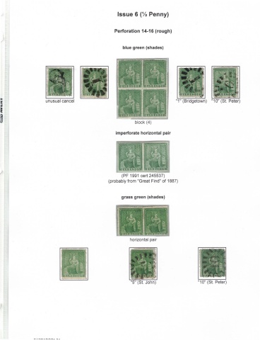 Issue 6 (½ Penny) Perforation 14-16 (rough) blue green (shades) block (4) imperforate horizontal pair (PF 1991 cert 245537) (probably from "Great Find" of 1887) grass green (shades) horizontal pair "5" (St. John)