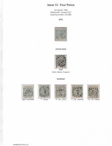 Issue 13 - Four Pence 1 st issued: 1882 Watermark: (crown)/"CA" Quantity printed: 223,680 grey arrival mark "569" North Allerton England bootheel open bootheel "1" (blue) "5" (St. John) "7" (St. James) "1 O" (St. Peter) BARBADOS-VR13-20