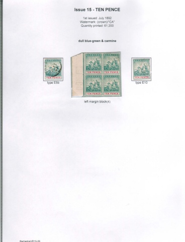 Issue 15 - TEN PENCE 1st issued: July 1892 Watermark: (crown)f'CA" Quantity printed: 61 ,200 dull blue-green & carmine type E5b type E10 left margin block(4) BarbadosVR15-26