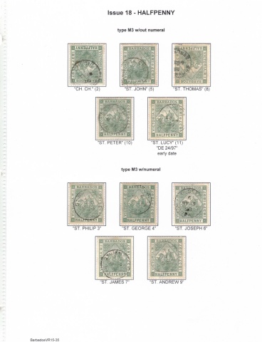 Issue 18 - HALFPENNY type M3 w/out numeral "CH. CH." (2) "ST. JOHN" (5) "ST. THOMAS" (8) "ST. LUCY" (11) "DE 24/97" early date type M3 w/numeral BarbadosVR15-35